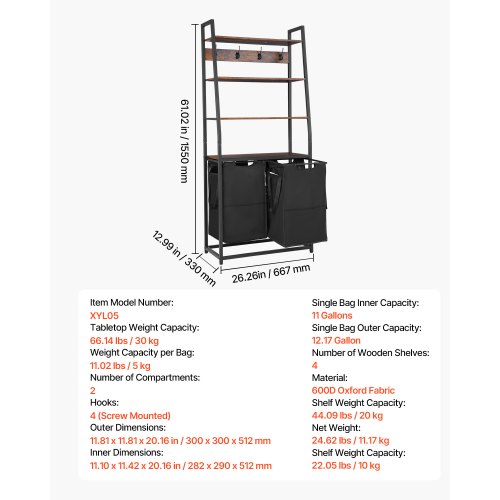VEVOR Over Washer and Dryer Storage Shelves, 6 Tiers Laundry Room Drying Rack with Hanger Rod and Hooks, Two Rows Adjustable Washer Shelves Space Saver, for Laundry Room Storage & Organization, Black