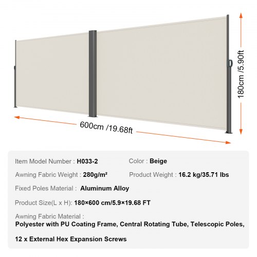 VEVOR Retractable Side Awning, 71''x 236'' Aluminum Outdoor Privacy Screen, 280g Polyester Water-proof Retractable Patio Screen, UV 30+ Room Divider Wind Screen for Patio, Backyard, Balcony, Beige