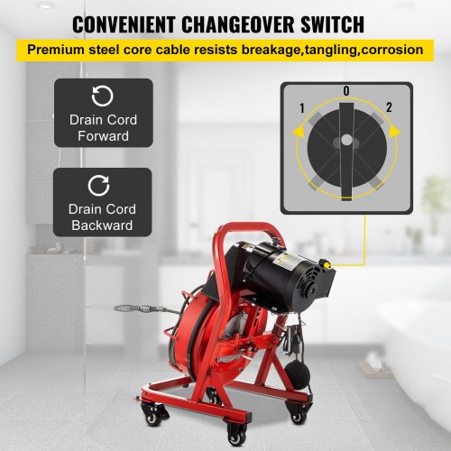 VEVOR 75FT x 3/8 Inch Drain Cleaning Machine, 250W Electric Drain Auger on Wheels, Portable Sewer Snake Auger Cleaner with Cutters & Air-Activated Foot Switch for 2" to 4" Pipes, Black, Red