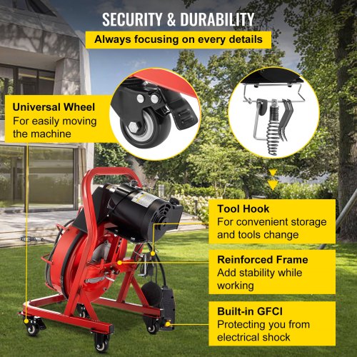 VEVOR 75FT x 1/2 Inch Drain Cleaning Machine, 370W Electric Drain Auger, Portable Sewer Snake Auger Cleaner with Cutters & Air-Activated Foot Switch for 1" to 4" Pipes, Black, Red