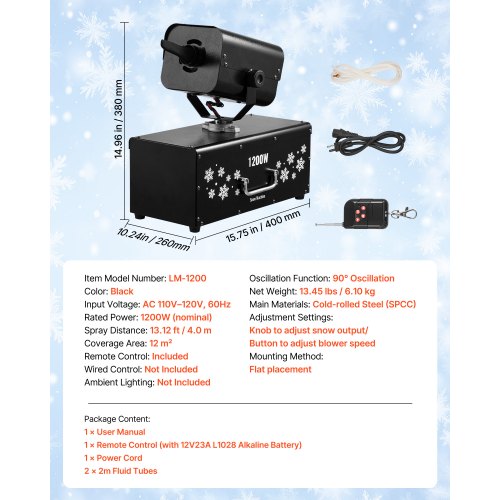 VEVOR Snow Machine, 1200W 90° Shaking Head Snow Maker with Wireless Remote Control, High Output Snowmaking Machine Coverage up to 12 ㎡ for Christmas Wedding Parties Stage Snowflake Effect