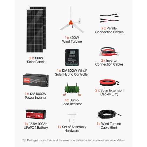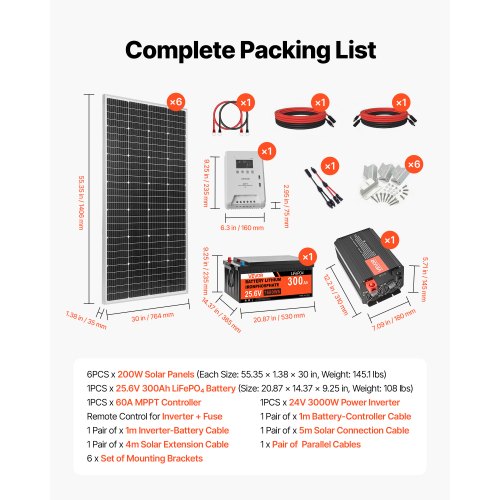 VEVOR 1200W 24V Complete Solar Power Kit, 6*200W Monocrystalline Panels + 25.6V 300Ah LiFePO₄ Battery + 60A MPPT Charge Controller + 3KW Power Inverter, High Output Solar Kit for Large House Shed Farm
