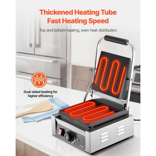 VEVOR Commercial Panini Grill, 1800W Electric Sandwich Panini Maker, Stainless Steel Sandwichs Press Grill with Handle and Temp Control, 8.8x9 in Full Grooved Enamel Plate for Hamburger Steak Bacon