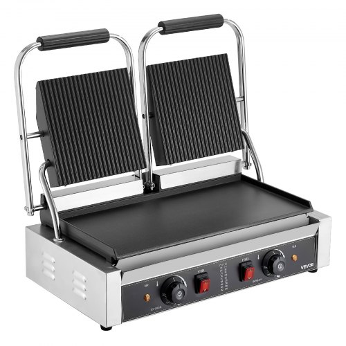 VEVOR Commercial Panini Grill, 3600W Electric Sandwich Panini Maker, Stainless Steel Double Sandwichs Press with Handle and Temp Control, 19x9 in Full Flat Enamel Plate, for Hamburger Steak Bacon