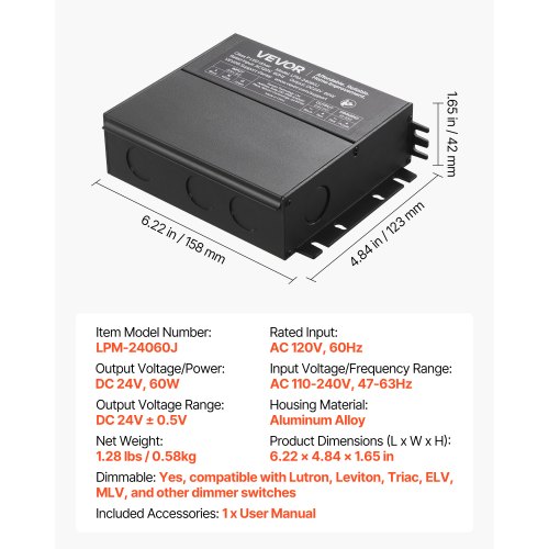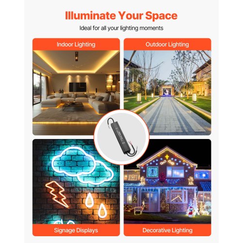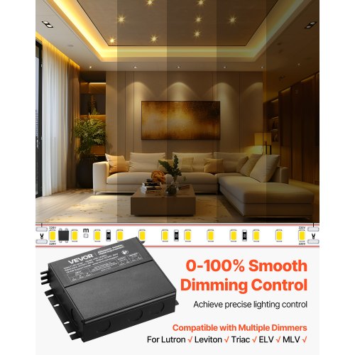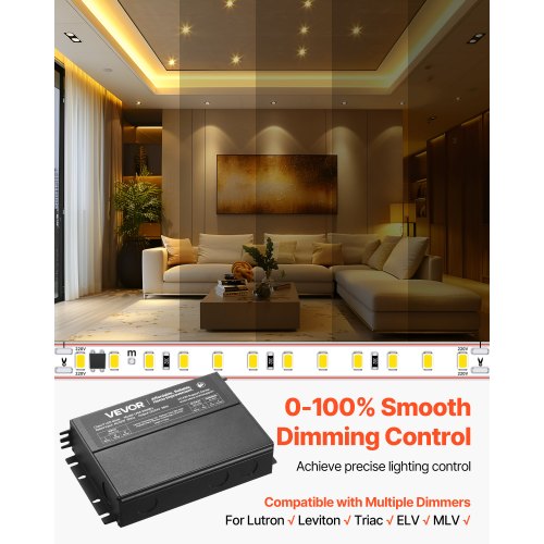 VEVOR 288W Dimmable LED Driver, 24V, Triac/ELV/MLV AC to DC Power Supply Transformer for LED Strip Light, Smooth Flicker-Free Dimming, Constant Voltage, Compatible with Lutron Leviton Dimmer Switches