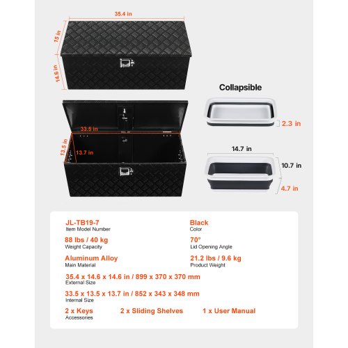 VEVOR Heavy Duty Aluminum Truck Bed Tool Box, Stripes Plated Tool Box with Sliding Shelf, Side Handle, Lock & Keys, Storage Toolbox Chest for Trailer, Pickup, Truck Bed, RV, 35.4"x14.6"x14.6", Black