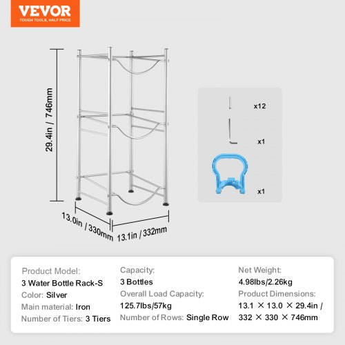 VEVOR 3 Tiers Water Jug Holder, 5 Gallon Water Bottle Holder, Single Row Water Bottle Rack for 3 Bottles, Heavy Duty Water Jug Rack for Kitchen, Office, Living Room, Silver