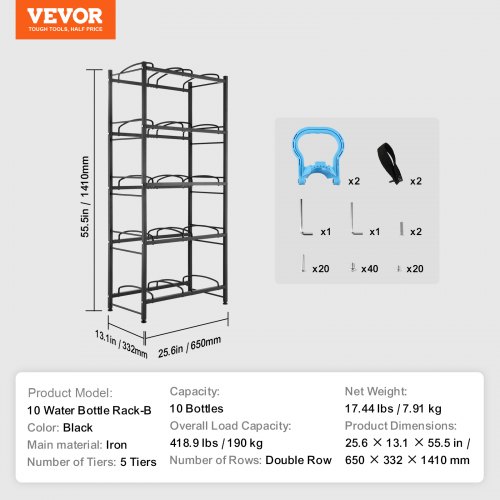 VEVOR 5-Tier Water Jug Holder Double Row Water Bottle Rack for 10 Bottles Black