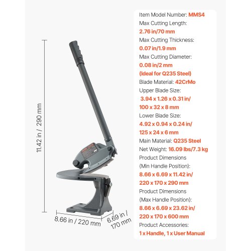 VEVOR Sheet Metal Shear, Manual Hand Shear, Throatless Benchtop Sheet Cutter for Multiple Purpose, with Solid Steel Frame, Mounting Type, Max Cutting Thickness 0.07 in for Steel Copper Rebar Aluminum