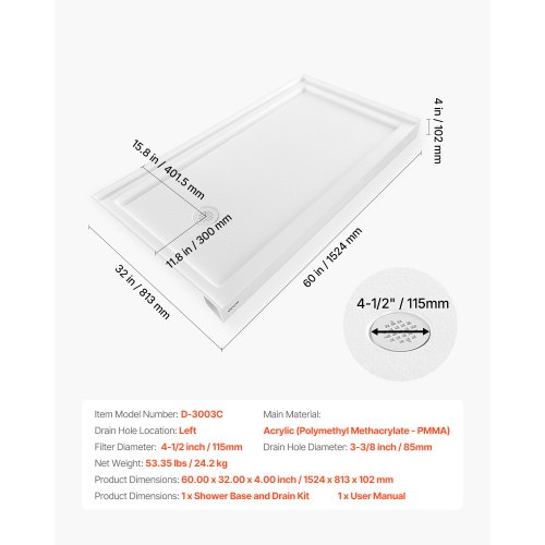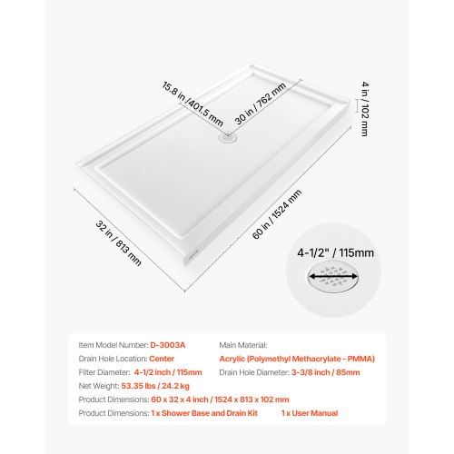VEVOR Shower Curb Kit, 60"x38" Shower Pan Kit with 6.3" Central Drain, Lightweight EPS Shower Installation Kits with 2 Waterproof Cloths, Shower Pan Slope Sticks Fit for Bathroom