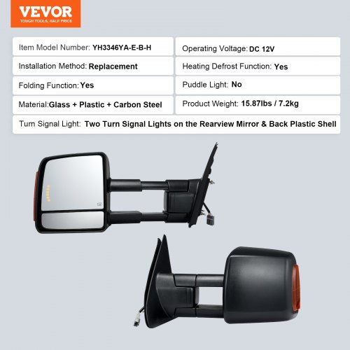 VEVOR Towing Mirrors, Left & Right Pair Set for 2007-2016 Toyota Tundra, Power Heated Tow Mirror with Signal Light, Plane & Convex Glass, Manual Controlling Telescoping Folding, Heating Defrost, Black
