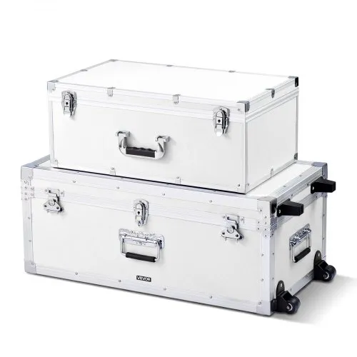 VEVOR Metal Storage Trunk, Set of 2, Wooden Suitcase Storage Boxes with Padlocks, Large Trunk Includes Casters and 3 Metal Handles, Decorative Store Chest with Lids for Travel, Apartment, Dorm, White