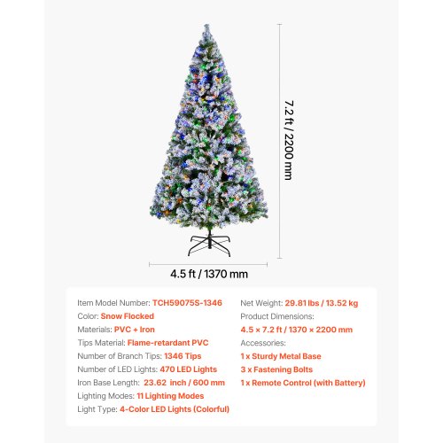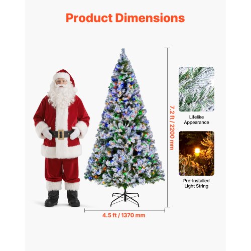 VEVOR Christmas Tree, 7.2ft Prelit Flocked Artificial Tree, Full Holiday Xmas Deco Trees with 470 Colorful LED Lights, 11 Lighting Modes & 1346 Branch Tips for Home Party Office Decoration