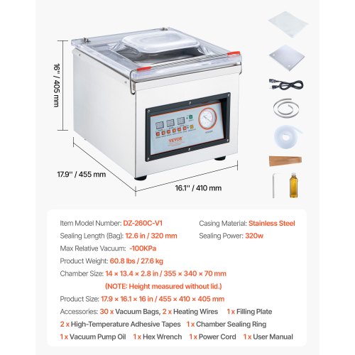 VEVOR Chamber Vacuum Sealer, 260W Sealing Power, Vacuum Packing Machine for Wet Foods, Meats, Marinades and More, Compact Size with 10.2" Sealing Length, Applied in Home Kitchen and Commercial Use