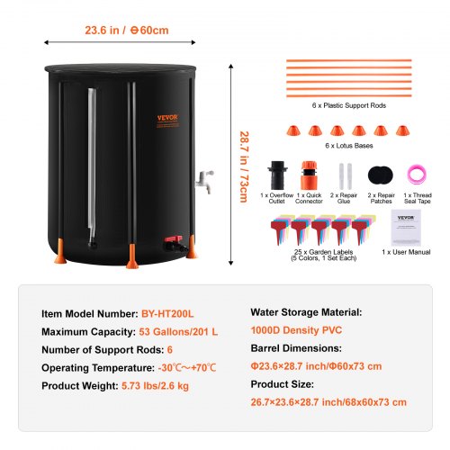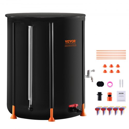 VEVOR Collapsible Rain Barrel, 53 Gallon Portable Rain Water Collection Barrel, 1000D PVC Rainwater Collection System, Garden Water Catcher Tank Storage Container with Spigot & Overflow Kit, Black