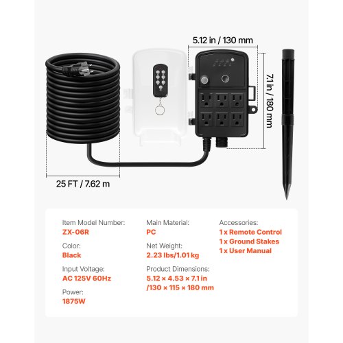 VEVOR Outdoor Power Stake, 25FT Extension Cord, Outdoor Power Strip Weatherproof with Cover, Remote Control Dusk to Dawn Light Timer Waterproof, 6 Outlets, 1875W/15A, for Christmas Lights, Garden