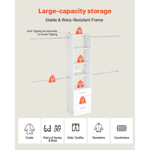 VEVOR Closet System with 3 Drawers, Adjustable Height Wooden Closet Organizers, Modern Walk-in Wardrobe Organization with 4 Retractable Clothes Hanger Rods, Freestanding Garment Rack Storage, White