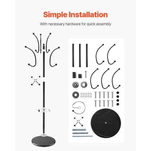 VEVOR Freestanding Coat Rack, Metal Coats Rack Stand with Umbrella Holder, Stable Marble Base & 14 Hooks, Hall Coat Tree for Entryway, Bedroom, Living Room, Stylish Coats Hanger for Hats, Scarves, Bag