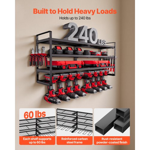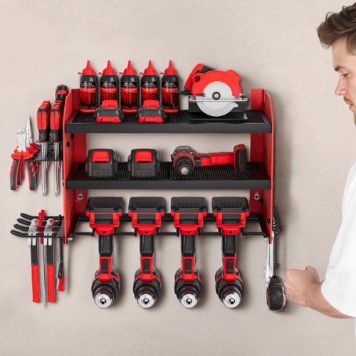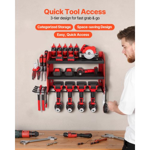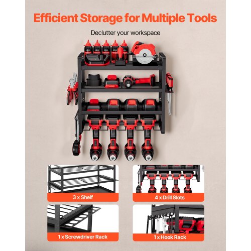 VEVOR Power Tool Organizer Wall Mount, 4-Layer Storage Rack with 4 Drill Holders, Tools Holder and Storage Rack with Screwdriver Holder, Garage Tool Organizer for Garage, Workbench, and Workshop