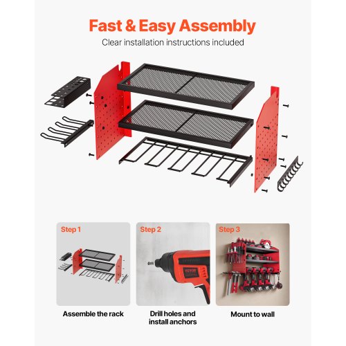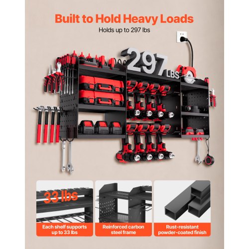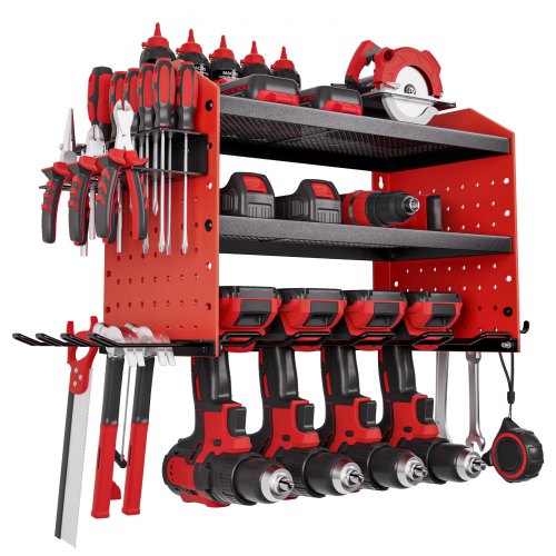 VEVOR Power Tool Organizer Wall Mount, 3-Layer Storage Rack with 4 Drill Holders, Tools Holder and Storage Rack with Side Pegboards, Garage Tool Organizer for Garage, Workbench, and Workshop