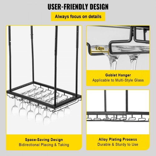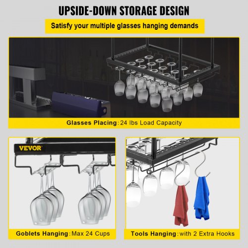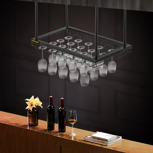 VEVOR Ceiling Wine Glass Rack, 23.6 x 13.8 inch Hanging Wine Glass Rack, 18.9-35.8 inch Height Adjustable Hanging Wine Rack Cabinet, Black Wall-Mounted Wine Glass Rack Perfect for Bar Cafe Kitchen