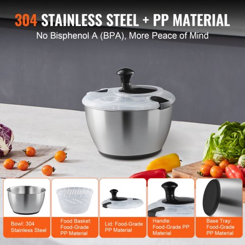 VEVOR Stainless Steel Salad Spinner, 4.75Qt, One-handed Easy Press Large Vegetable Dryer Washer, Lettuce Cleaner and Dryer with 304 Stainless Steel Bowl, for Greens, Herbs, Berries, Fruits, No BPA