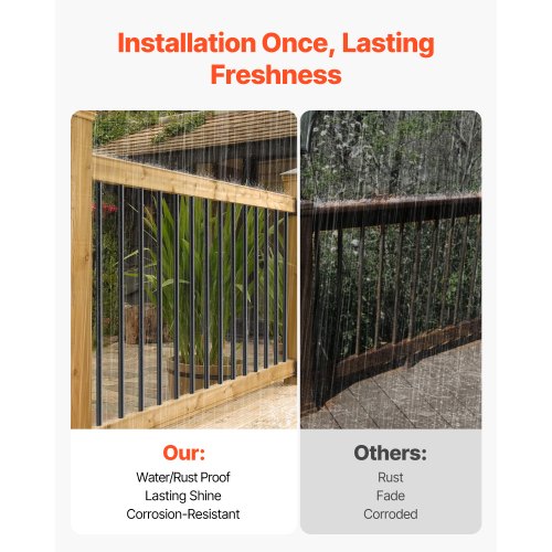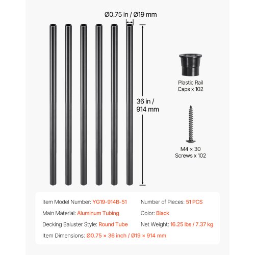 VEVOR Staircase Balusters 101 Pack, 36 In Aluminum Stair Balusters, 3/4 Inch Water-Proof Round Metal Spindle Railing, Hollow Deck Railing with Rail Caps & Screws for Stairs, Porch, Patio, Matte Black