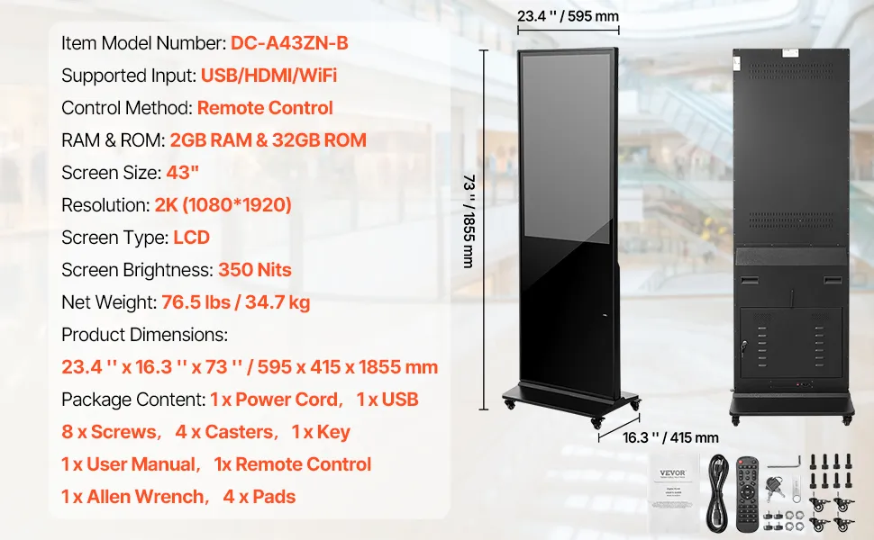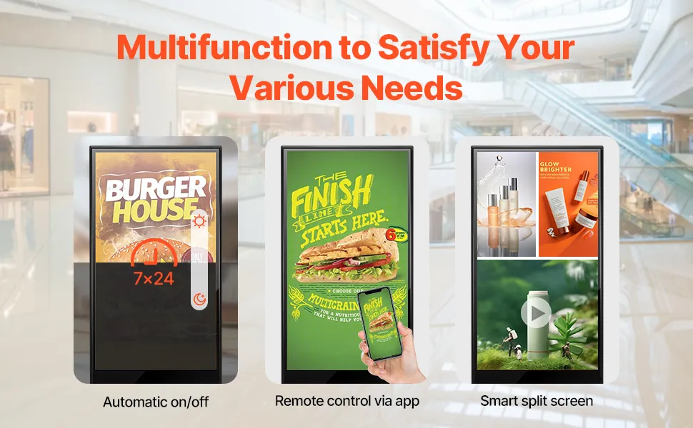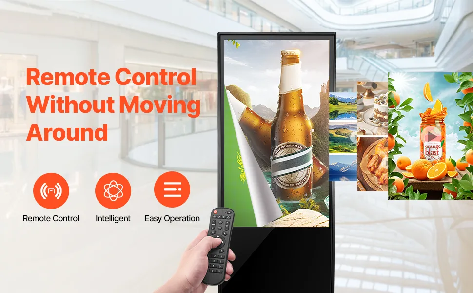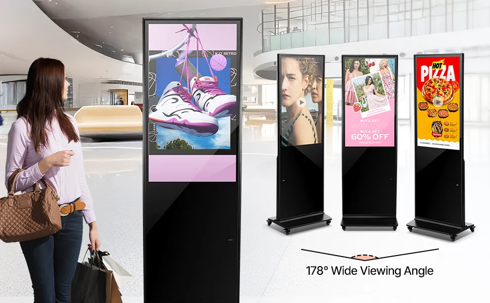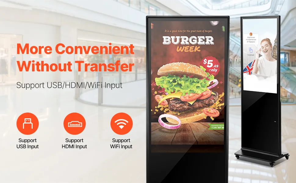 Multifunctional & Versatile: Set timers to power on/off, saving energy and effort. Remotely control the digital signage display for multiple stores, making it ideal for chain businesses. Equipped with wheels for easy mobility. Widely used in bars, restaurants, hotels, clothing stores, libraries, and more