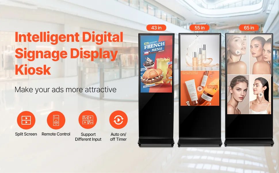 Intelligent Split Screen: The upgraded split screen allows you to play images and videos at the same time, as well as customize the size, position, and orientation of each display area. This makes the digital signage kiosk perfect for showcasing multiple advertisements at once. It also comes equipped with powerful speakers, enhancing the attractiveness of your ads