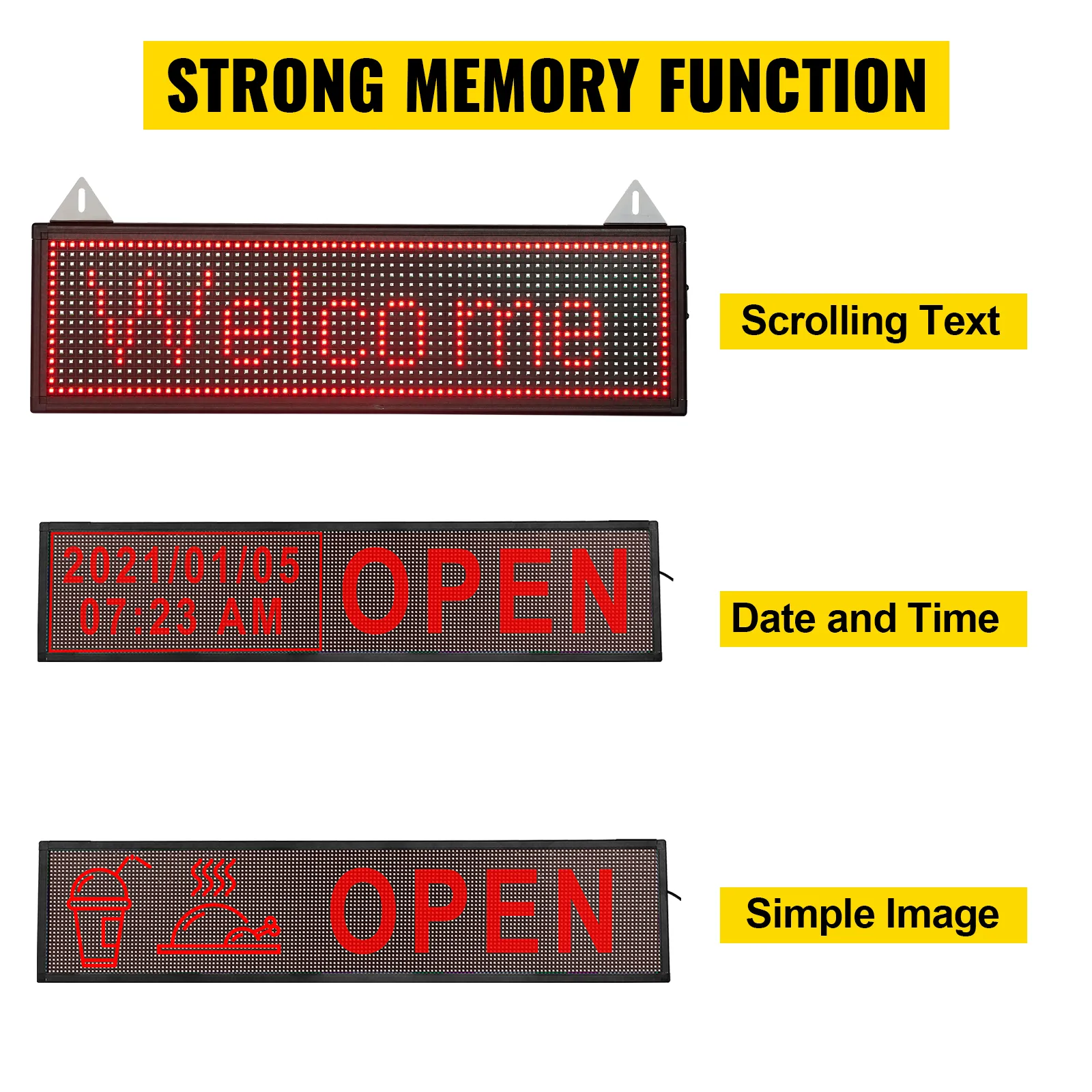 The Wi-Fi LED sign can display text, time, and company logos. Up to 100 messages and logos are supported. Thanks to a powerful memory function, you don’t need to worry about losing your messages even when the power is off.