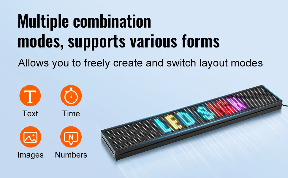 This VEVOR programmable LED sign has full-color display capabilities. It is bright and eye-catching, visible at any time of day. The vivid colors ensure your message stands out even in direct sunlight. Text remains clear, and full-color display allows for more creativity. You can choose from a wide range of colors and effects. This makes it easier to match your brand's colors. Brightness may be adjusted to suit different lighting conditions. Therefore, this feature makes it suitable for various environments.
