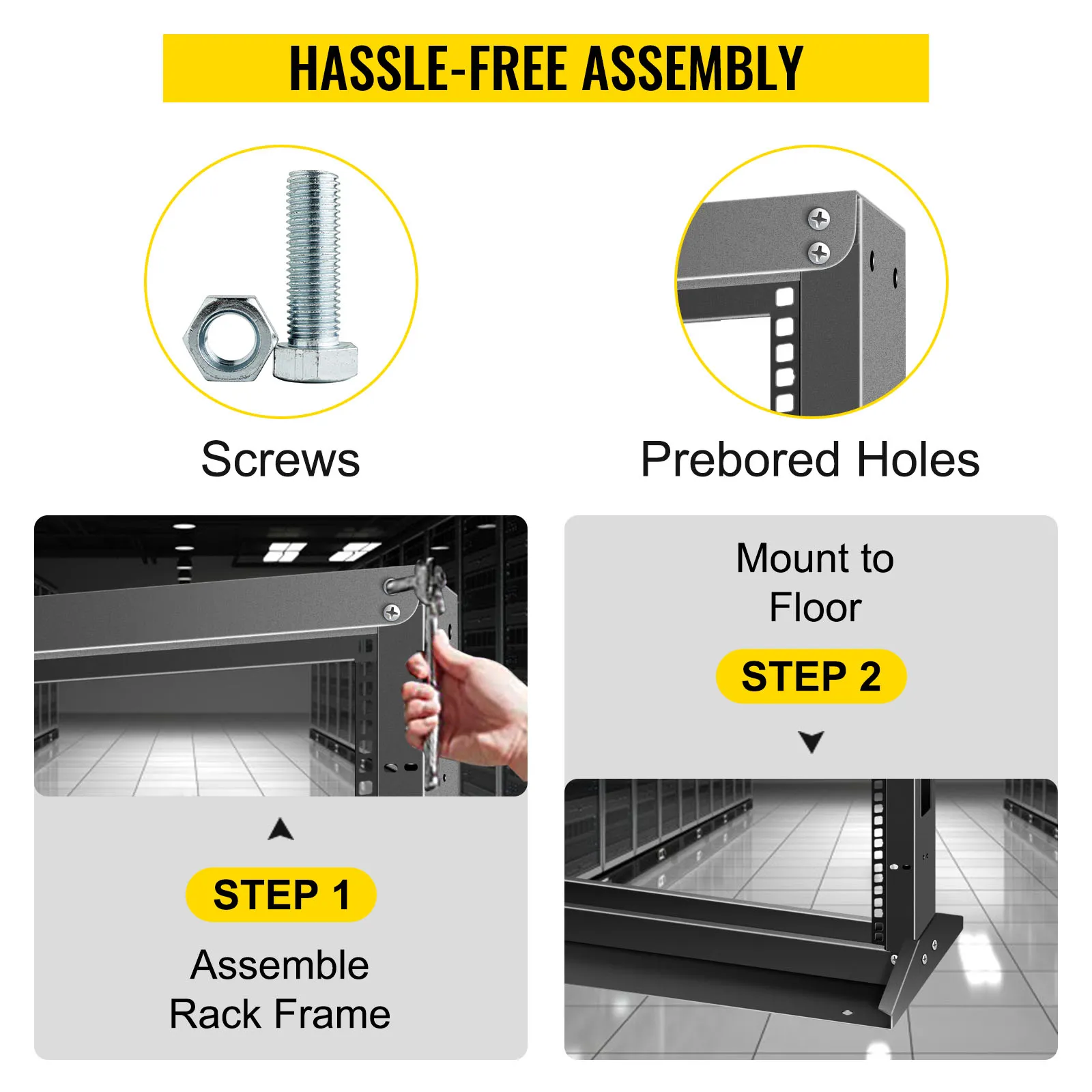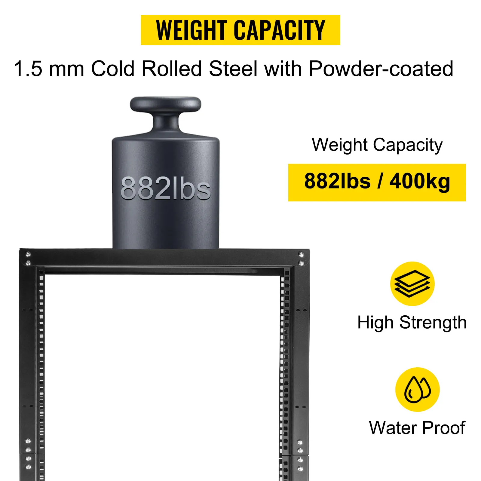 VEVOR’s 2-post open frame server rack is an ideal, economical solution for secure IT environments and other applications not requiring a lockable enclosure. Our product provides 45U of rack space and can support a total weight capacity of up to 882 lbs. The rack features heavy-duty cold-rolled steel construction, easy assembly, and a spacing-saving design. It offers a reliable solution for mounting servers, UPS, and other rack-mountable equipment.