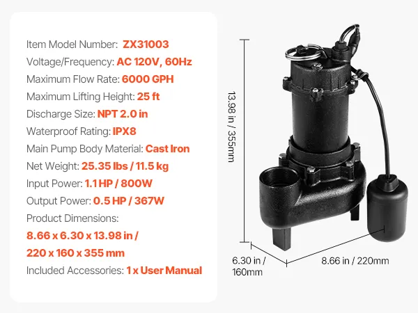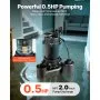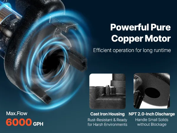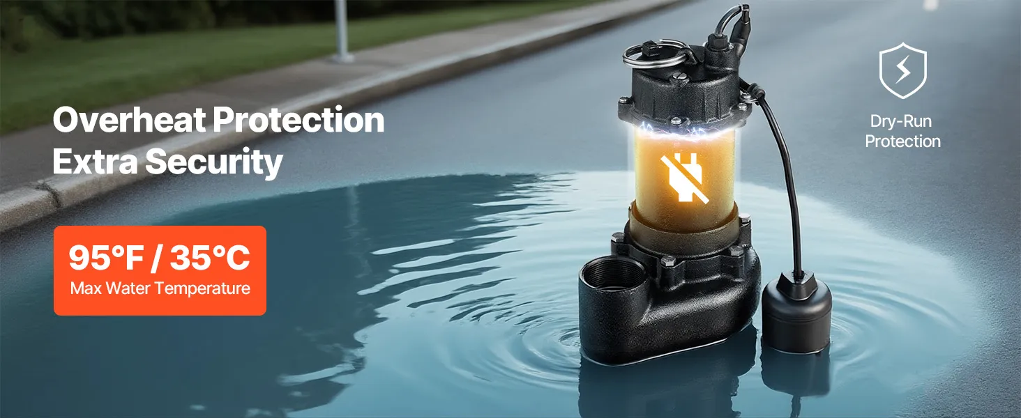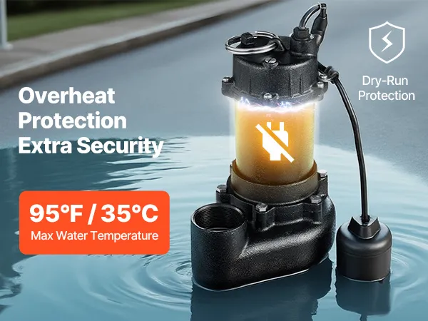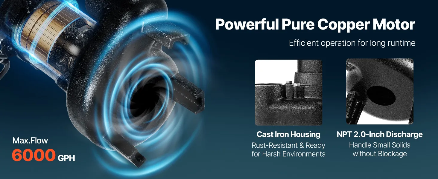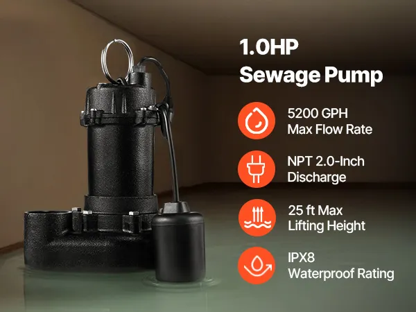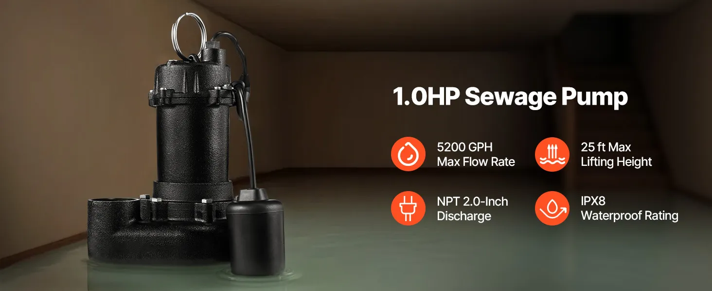 1/2 HP Powerful Performance: This sewage pump delivers up to 6,000 GPH and lifts water vertically up to 25 ft. Powered by a pure copper motor with overload protection, it keeps your basement dry even under heavy water flow, such as rain, melting snow, etc