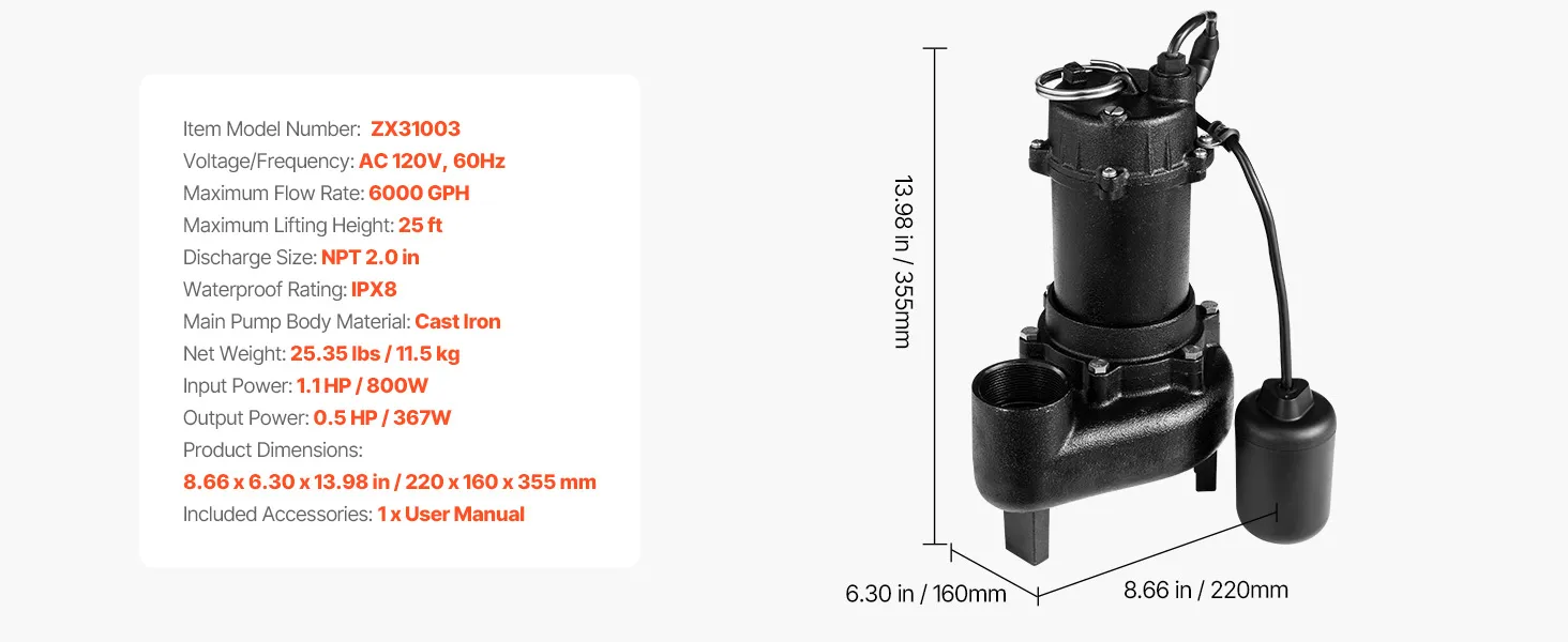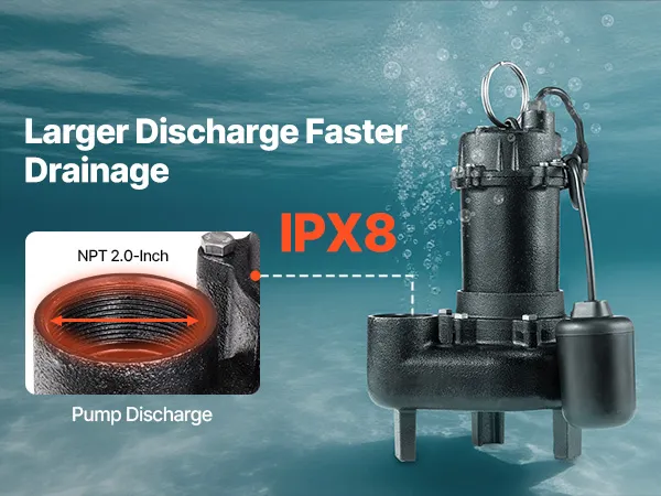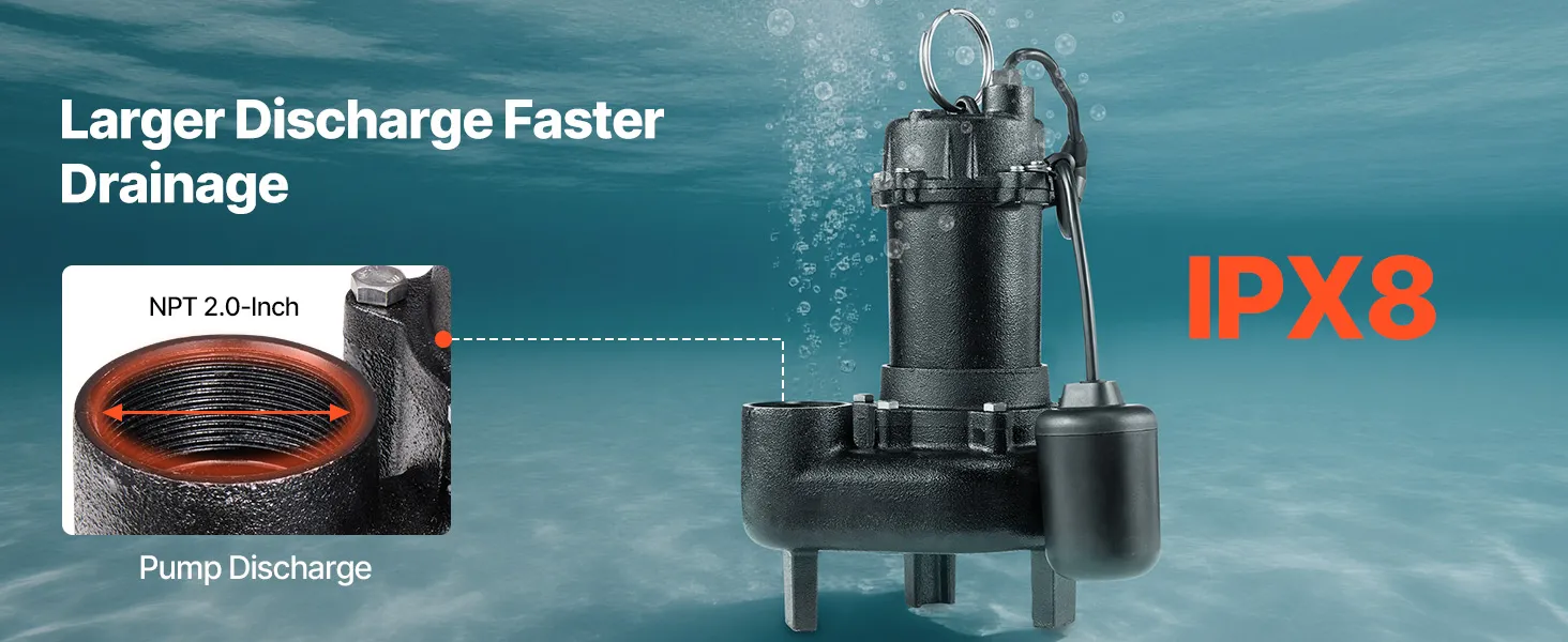 Durable Materials, Built to Last: Features a rust-resistant cast iron frame, our submersible sewage pump ensures long-term underwater use. With an IPX8 waterproof rating, it is ready for full submersion and demanding drainage tasks