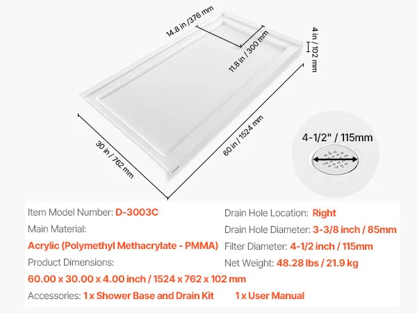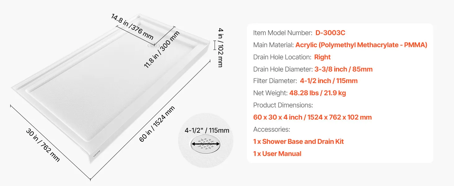 Standard Size: This 60″ L x 30″ / 1524 x 762 mm shower pan comes with a marked right drain position, making it easier to verify alignment before installation. Check fit before opening—no extra measuring, no delays
