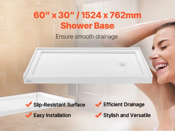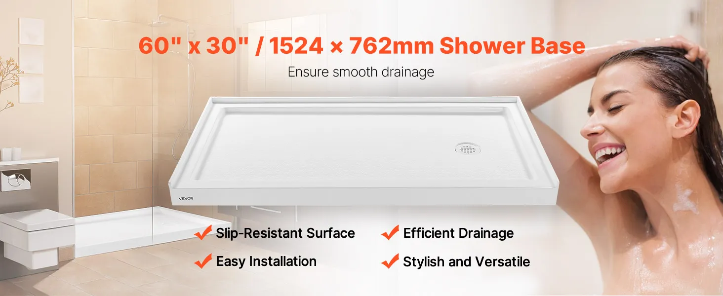 60″ L x 30″ Acrylic Shower Base with Drain Kit, Anti-Slip Surface