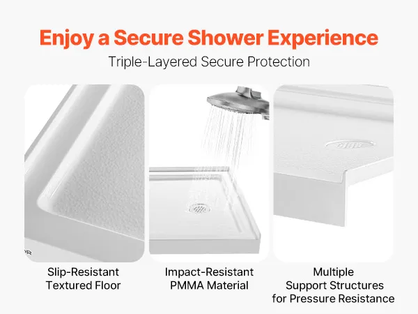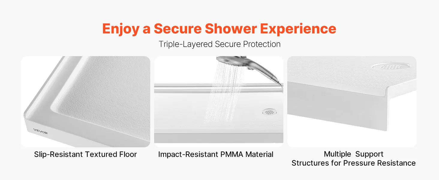 Built for lasting performance, our shower pan base is designed with a slip-resistant textured surface, durable PMMA impact-resistant material, and a multi-point support structure underneath. This triple-layer construction ensures long-term use without warping or slipping.
