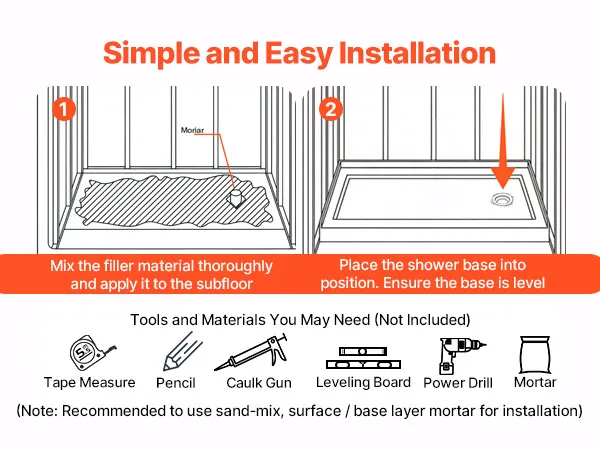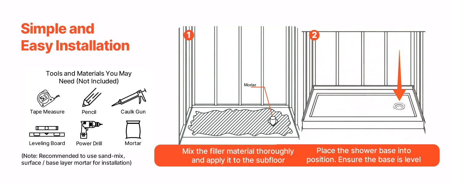 The shower pan includes a step-by-step guide for simple setup. It's compatible with most standard drainage systems and works great when installed with mortar or sand mix. We recommend leveling the subfloor before setup to prevent standing water—professional installation encouraged.