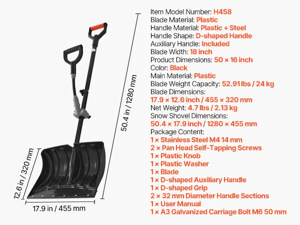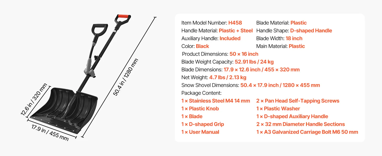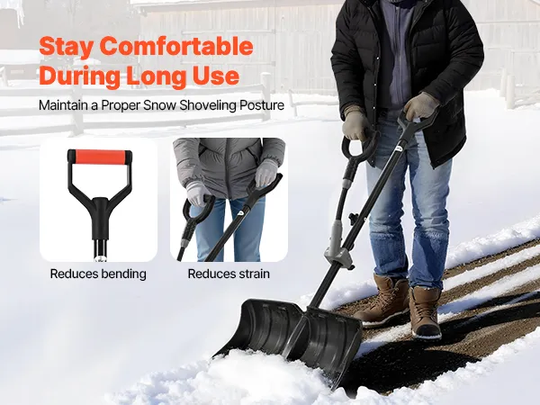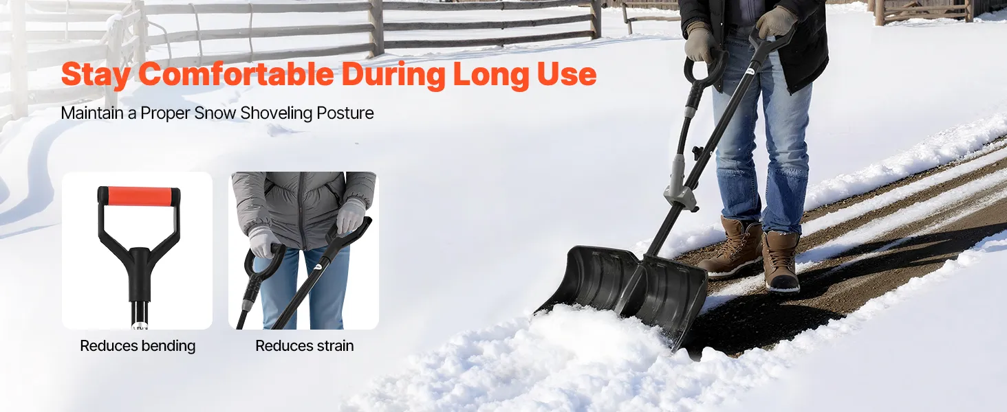 Comfortable & Easy Operation: The heavy duty snow shovel measures 50.4 in in length and features a user-friendly assistant handle to ease the waist strain. The top D-shaped handle and twist lock provide secure control while keeping the shovel stable