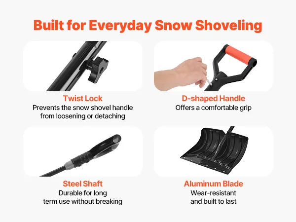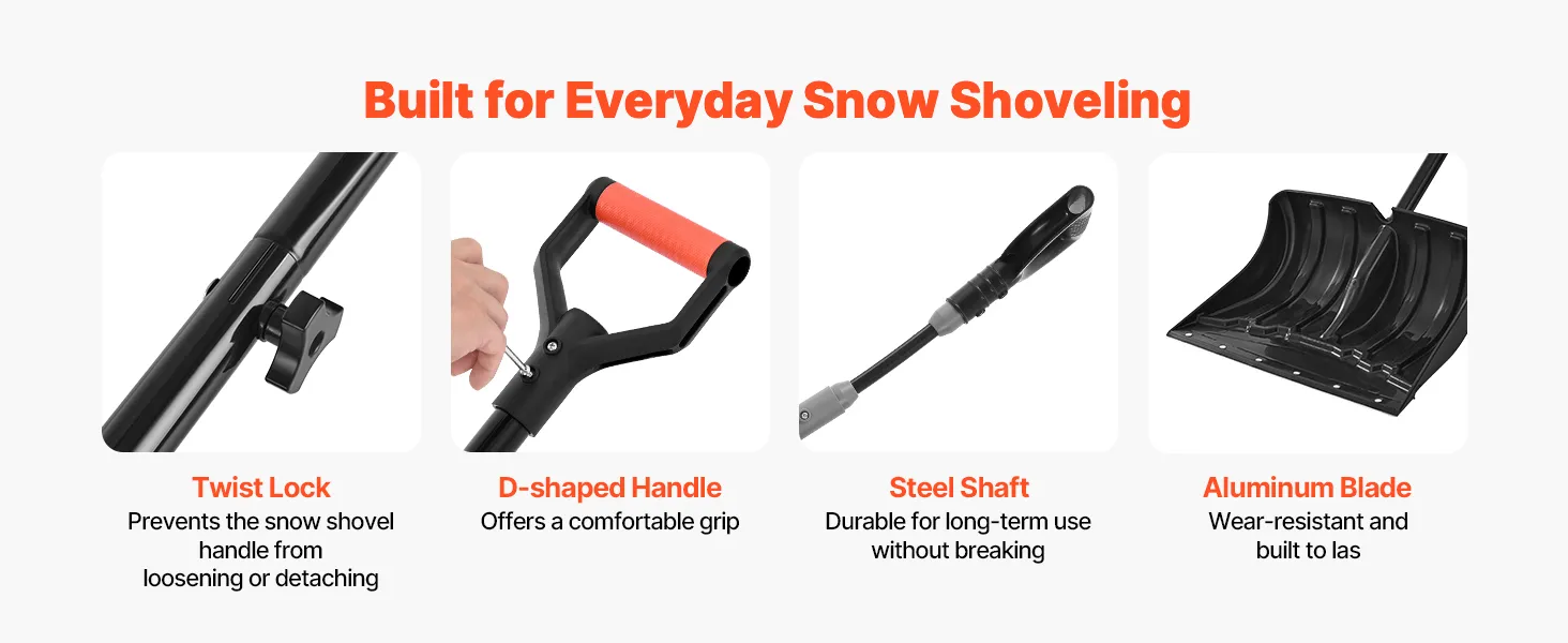 The D-shaped handle of the snow shovels fits the hand shape for a stable grip without freezing. It supplies with a sturdy and wear-resistant aluminum shovel blade and paired with a steel shaft plus wist lock structure to keep the shaft from loosening and breakage, improving cleaning efficiency