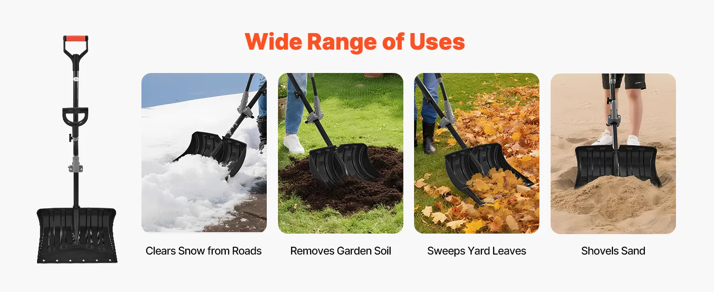 This plastic snow shovel can be used to clean snow, clean up fallen leaves, do gardening work, and level sand or soil. Suitable for various household or outdoor scenarios. Whether for city commuting, suburban homes, or outdoor camps, it’s an essential multifunctional tool for year-round use.