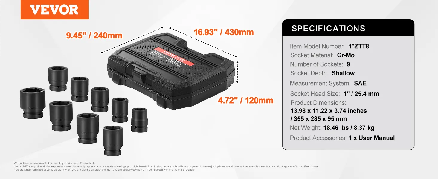 VEVOR Axle Nut Impact Socket Set 1" Drive 6-Point 9-Piece