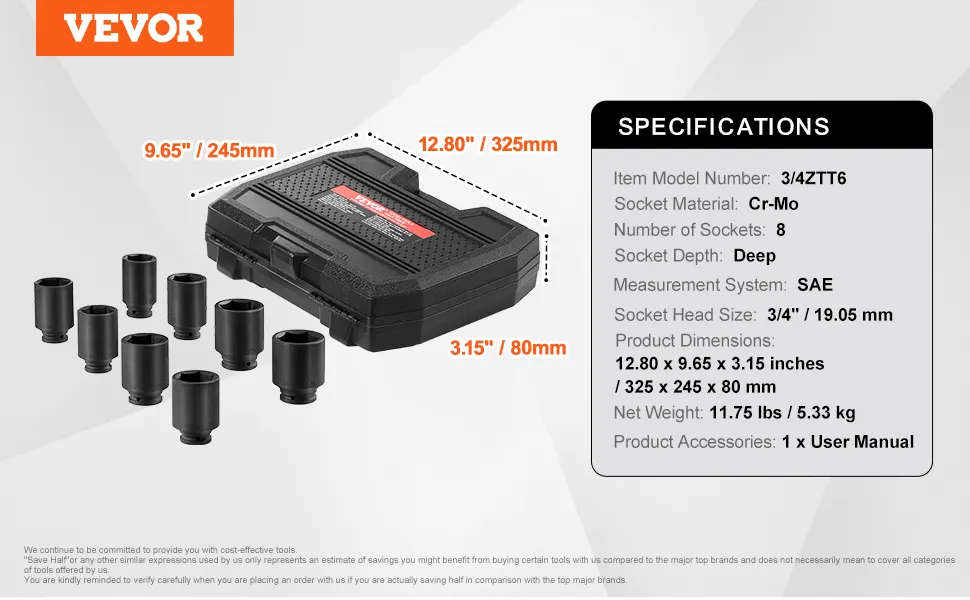 VEVOR Axle Nut Impact Socket Set 3/4" Drive Deep 6-Point 8-Piece