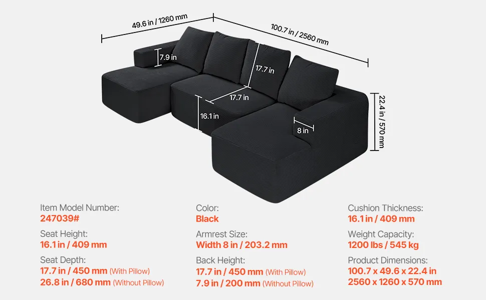 Spacious and Supportive Seat: With a 17.7 inches / 450 mm deep seat and a solid 1200 lbs / 545 kg capacity, this U shape couch provides roomy comfort and reliable support for deep relaxation.