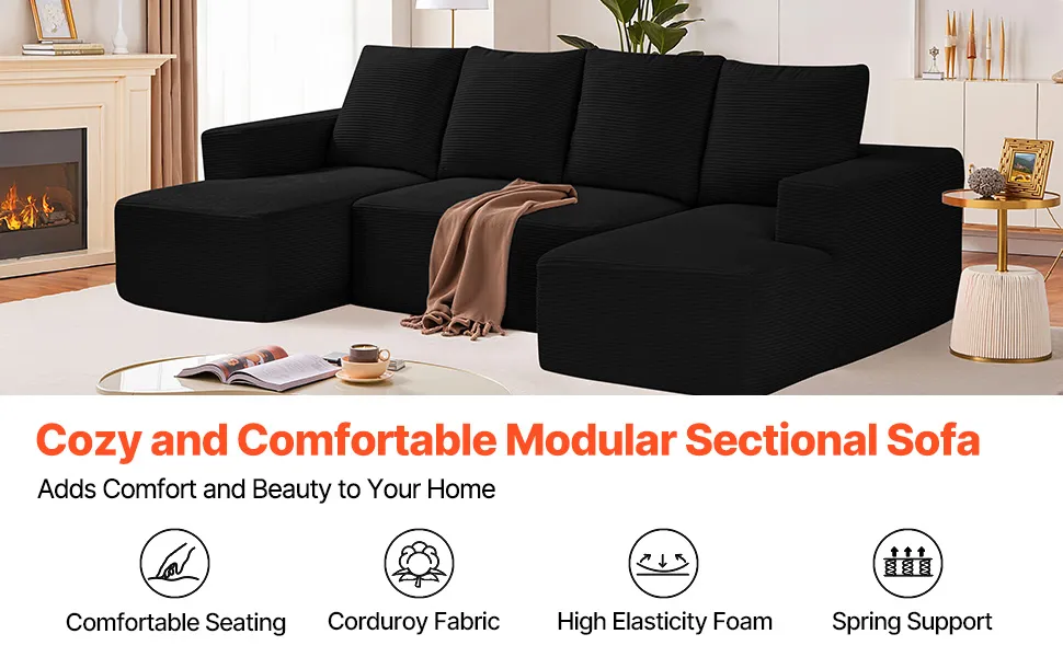 VEVOR Modular Sectional Sofa, U Shaped Modular Sofa with Chaise, Cloud Sectional Couch with High Rebound Sponge and Density, Upholstered Corduroy Couch with Cushion for Living Room, Bedroom, Black