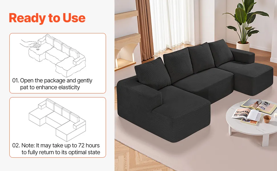 Just unpack, fluff up, and your modular sofa is ready to go! Give it 72 hours to fully expand and settle into its form.