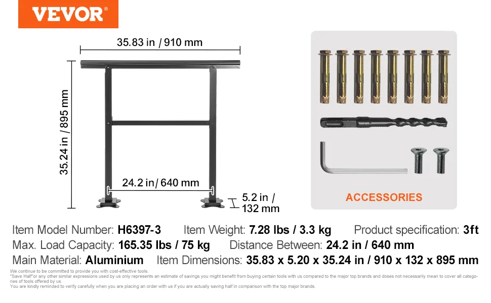 The VEVOR outdoor handrail is an exquisite fusion of strength and style designed to improve the appearance and safety of your outdoor staircases. Constructed from hard, premium materials, this strong railing offers dependable assistance and long-lasting performance. Its elegant form provides a safe and comfortable grip while enhancing any indoor or outdoor area. For anyone looking to combine modern style with functionality, this aluminum stair railing is a great option for both residential and commercial spaces.