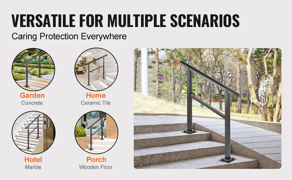 The versatile design of this stair railing makes it an essential addition. Whether installed on concrete, brick, or wood steps, this railing adapts to various surfaces. This makes it ideal for porches, balconies, gardens, residential buildings, hotels, and garages. Its solid construction ensures stability, even in areas where wall attachment isn't possible. This provides a secure solution for spaces where extra support is required.
