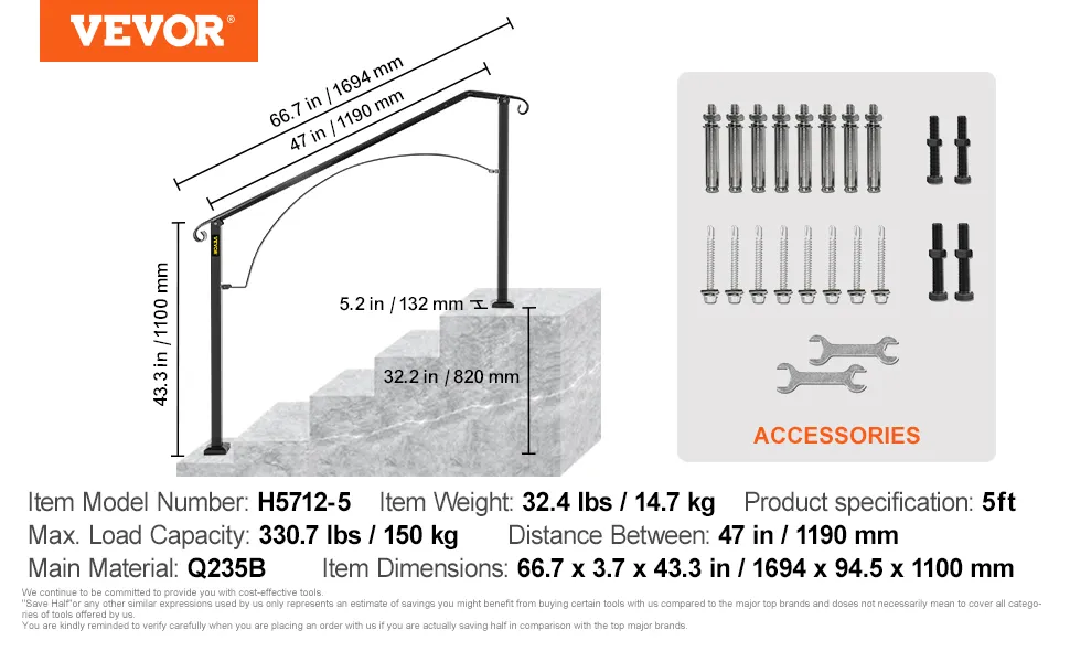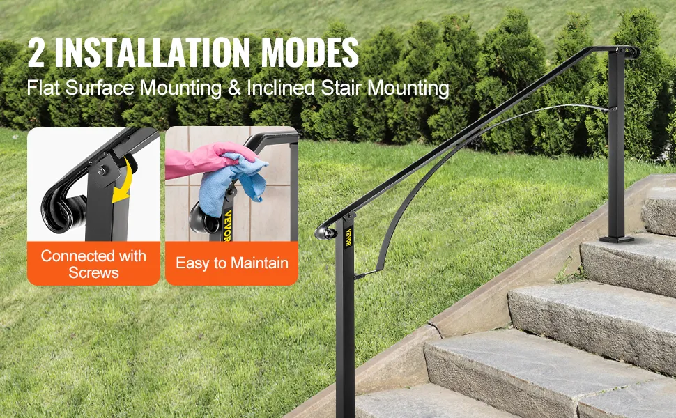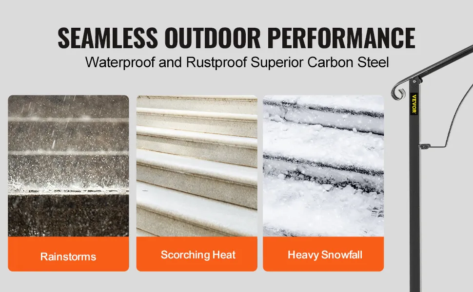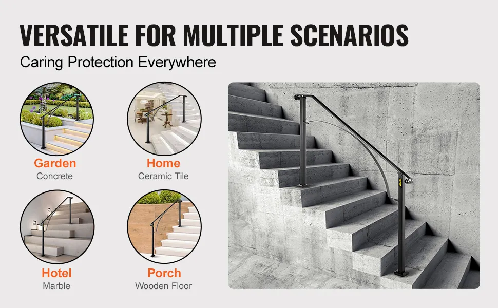 The VEVOR handrails are ideal for various surfaces. They work well as handrails for concrete steps. Also, they fit perfectly on wooden stairs. This versatility makes them a great choice for different homes. Whether you have redesigned your home with modern concrete or traditional wooden steps, these handrails provide safety and support. The design of the handrails complements both concrete and wood. You can enjoy the same level of safety while also enjoying style on any type of stairs!