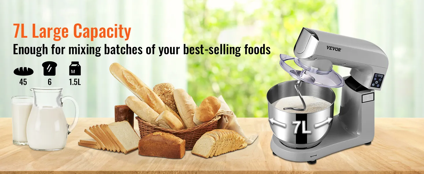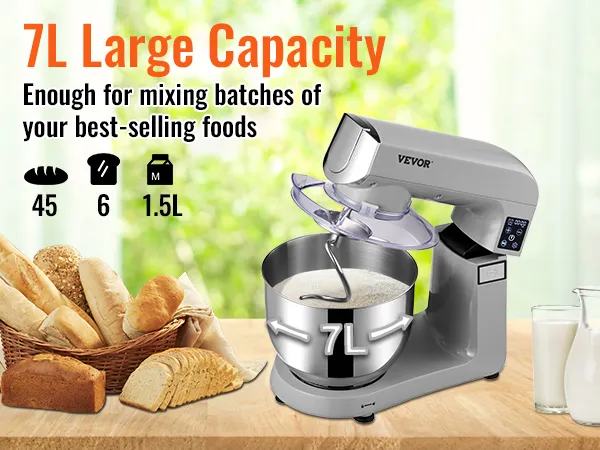VEVOR stand mixer features a 7.4Qt stainless steel bowl mixer. This bowl is not only durable but also hygiene-friendly. Stainless steel is easy to clean and resists rust and corrosion. The large capacity bowl allows you to prepare big batches easily. It's perfect for families, parties, or small businesses. Our stand mixing bowl has been designed to last and withstand frequent use. It ensures your ingredients are thoroughly mixed. The stainless steel adds to the overall aesthetic of the mixer, making it hygienic. Experience durability and hygiene with this high-capacity stainless metal bowl.